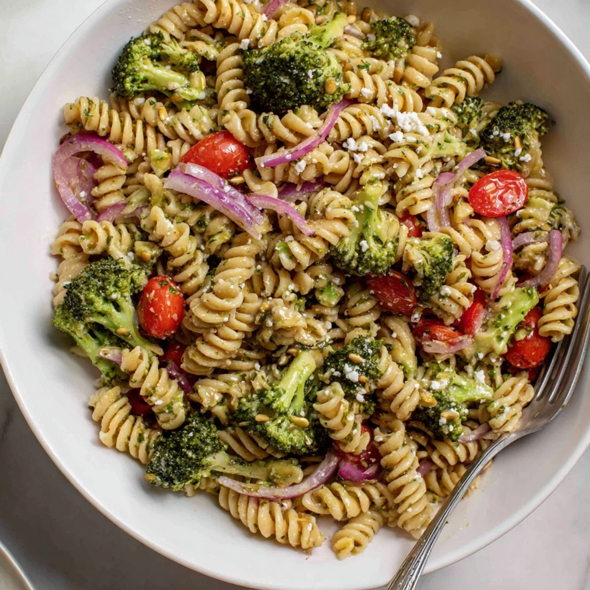 This vibrant mix combines blanched broccoli florets with al dente short pasta, halved cherry tomatoes, red onion and bell pepper. A zesty dressing of olive oil, red wine vinegar, lemon and Dijon mustard is whisked until emulsified and tossed through while warm to coat evenly. Finish with crumbled feta and toasted sunflower seeds if desired, then chill briefly to let flavors meld before serving cold or at room temperature.