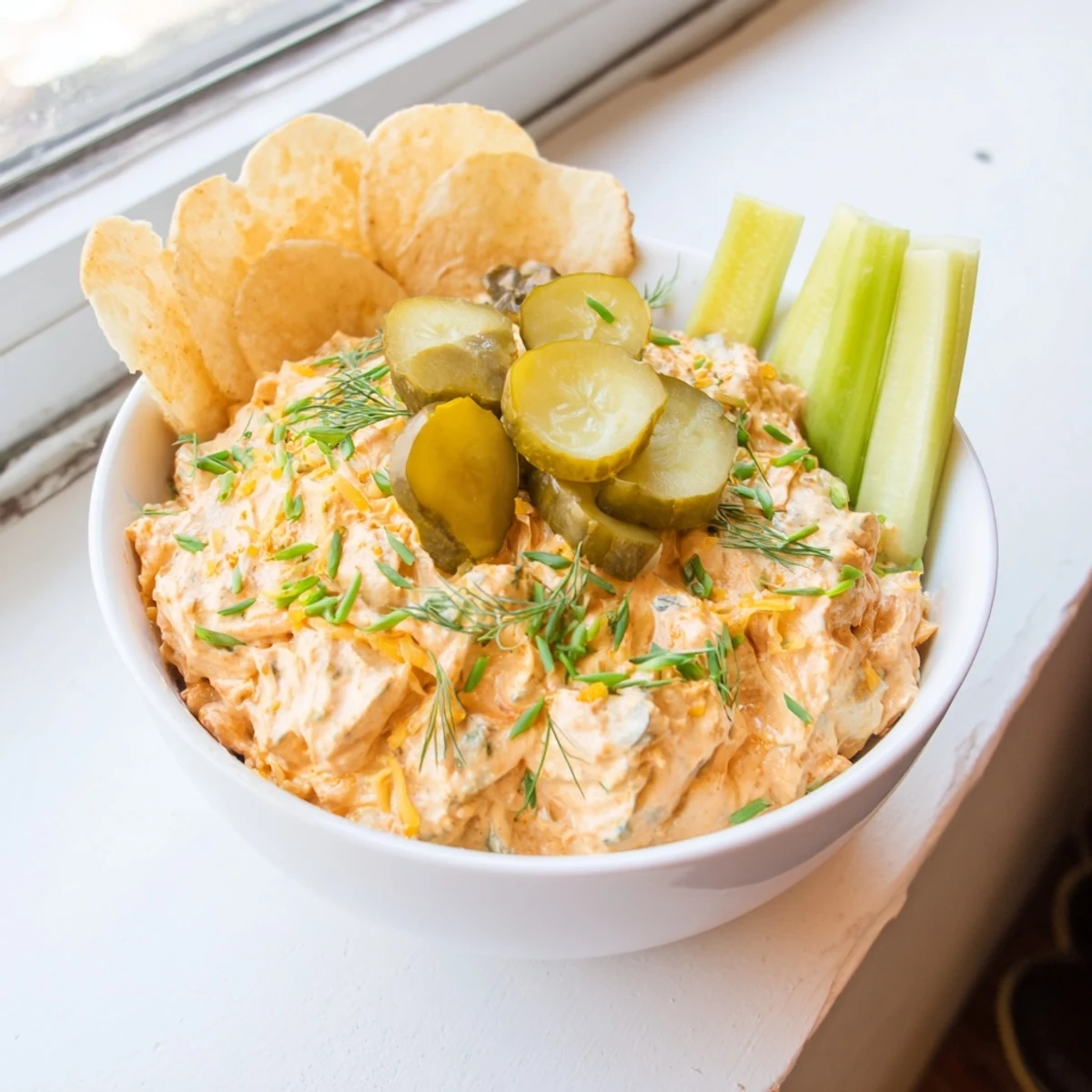 This zesty combination brings together the bold heat of buffalo wing sauce with the satisfying crunch of chopped dill pickles. The creamy base starts with softened cream cheese blended smoothly with sour cream and mayonnaise, creating the perfect canvas for the bold flavors to shine. Sharp cheddar adds richness while optional blue cheese brings that classic wing pairing element. Fresh chives and garlic powder round out the seasoning, adding layers of flavor that make each bite more interesting than the last.