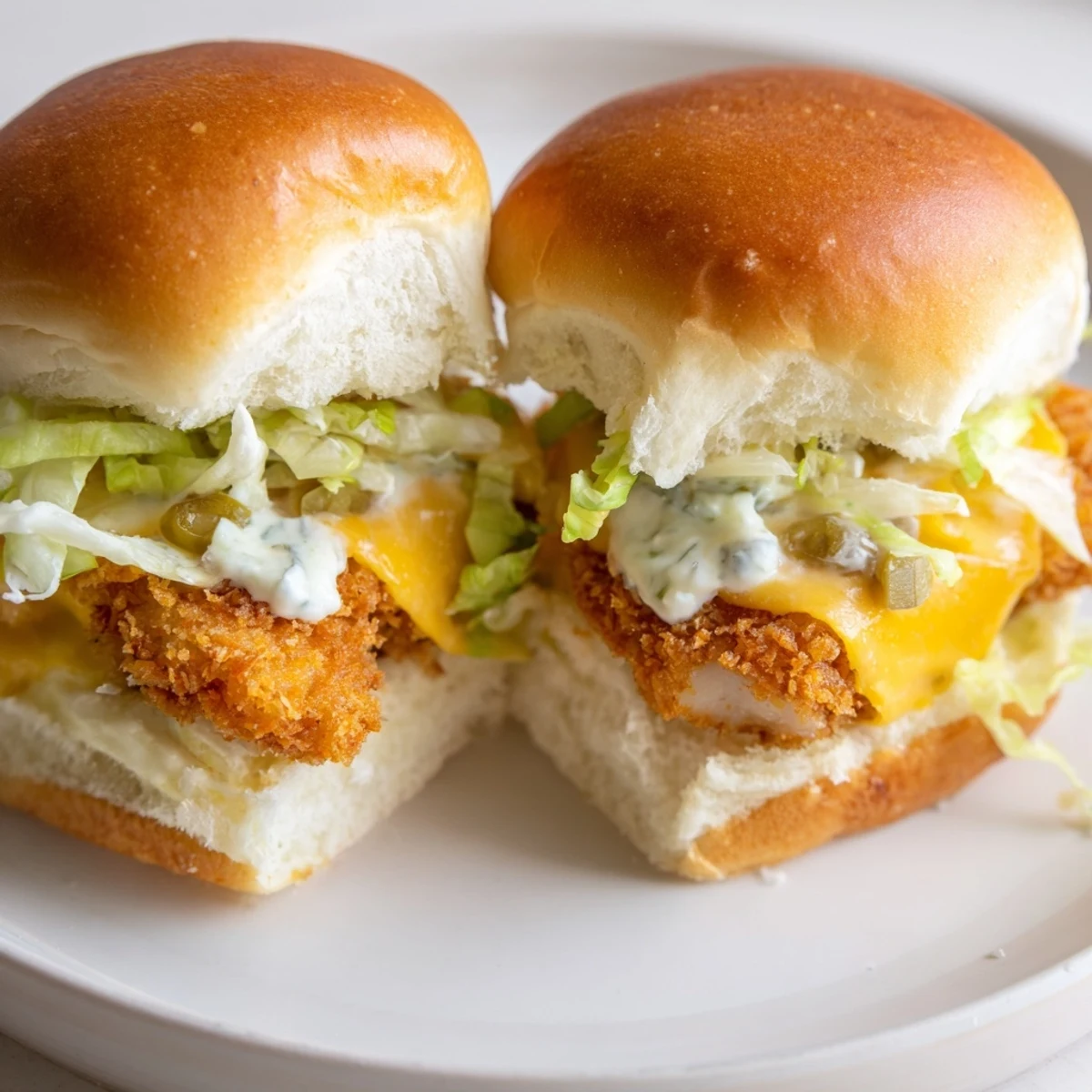 The star of the show is the house-made tartar sauce—tangy mayonnaise blended with chopped pickles, capers, fresh parsley, and a hit of Dijon mustard. Pile each crispy fillet onto toasted slider buns with melted cheddar and crisp lettuce for the ultimate bite-sized indulgence.