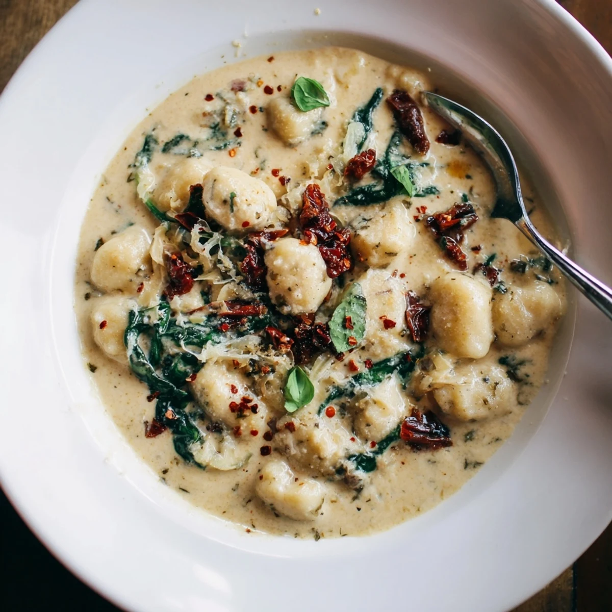 Cook gnocchi until they float, then fold into a silky pan sauce made by sautéing onion and garlic with chopped sun-dried tomatoes, simmering in heavy cream and melting in grated Parmesan. Add baby spinach to wilt and finish with torn basil. Toss with reserved pasta water to adjust consistency, season to taste, and serve immediately with extra Parmesan and a drizzle of olive oil.