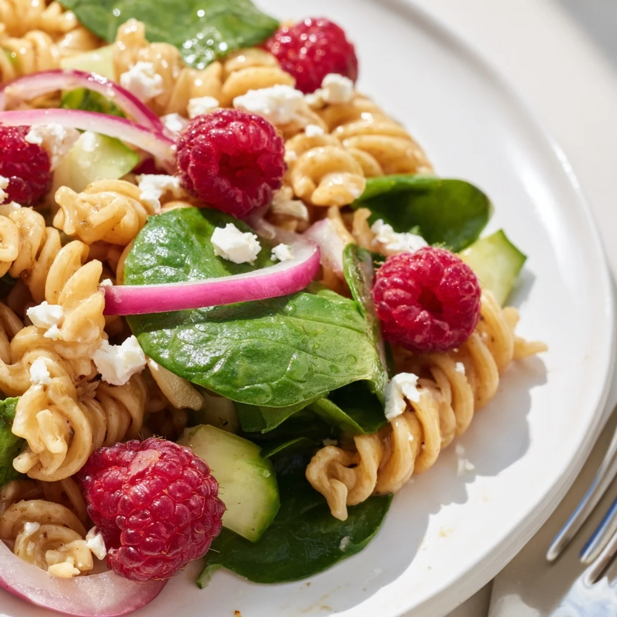 - Mix cooled pasta spinach red onion cucumber and half the raspberries in your largest bowl